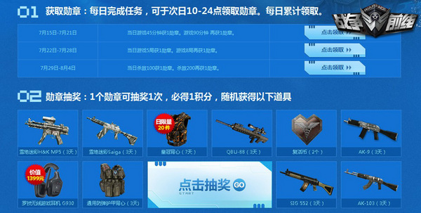 截至8月4日前,玩家在游戏中完成指定任务,即可于次日在活动页面领取“夏日勋章”一枚。为了提升活动的趣味性,《战争前线》分别于不同时期设置了三种每日任务。其中,7月15日至7月21日的每日任务为“当日游戏45分钟”;7月22日至7月28日则为“当日游戏5局”;而在7月29日至8月4日期间,玩家则需要当日杀敌100方可获得“夏日勋章”。