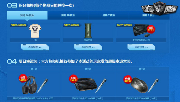 与此同时,通过消耗一定数量的积分,玩家还可以兑换更多精美实物、道具奖励。目前,包括价值299元的罗技游戏套装G100、限量周边T恤、实用水壶、皇冠M240B、皇冠手套、雪地迷彩AWM等在内的十几款好礼均已开放兑换,有兴趣的玩家不妨抢先一试。此外,参加活动的玩家还有机会获得官方送出的“夏日幸运奖”,除了实用道具冰锥之外,第一名、第二名、第三名将依次获得罗技无线游戏耳机麦克风(价值1499元)、罗技游戏键盘G510(价值499元)、罗技游戏鼠标G500(价值399元)。