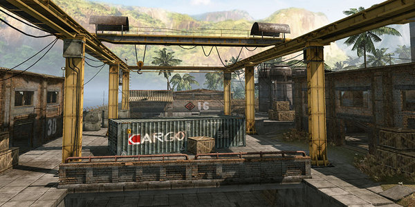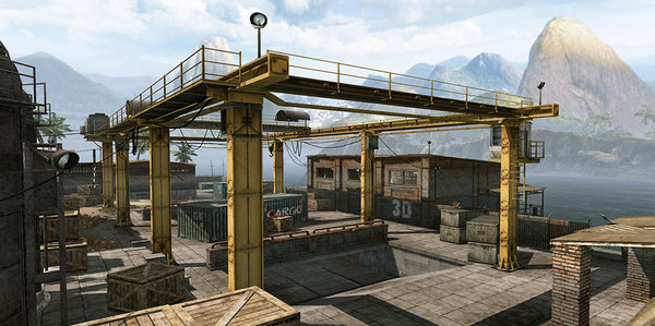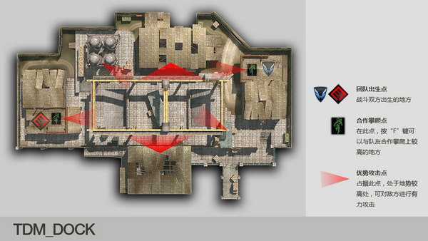 碧海映蓝天,棕榈影婆娑。浓郁热带风情的码头,平静之下暗藏杀机。前线军团与黑木帝国即将在此展开殊死较量。风起云涌之间,战争一触即发!战术鸟瞰图该地图共分为地下通道、地面及楼上三层,让战斗极具多变性。合理利用地势地形,占据优势攻击点,会让团队处于有利地位。码头场景图