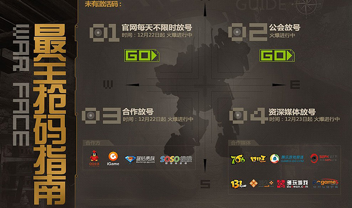 最全抢码指南再度重磅出击 为了让更多关注《战争前线》的玩家,可以尽早体验到精彩的游戏内容。2011年12月22日起,包括官网、各游戏公会、众合作平台、资深媒体在内的十余项放码活动将相继开启。而官方也将把众多放码渠道整理集合出来,作为“最全抢码指南”放出供玩家们参考。 自精英封测开启以来,国内外FPS玩家们曾一度面临《战争前线》“一码难求”的窘境,此次于圣诞版本上线之际再度加量放号,也将满足更多枪战游戏爱好者的体验需求。