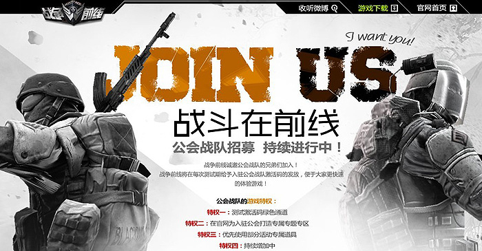 游戏公会招募火热进行中 作为一款由德国Crytek公司研发的军事射击类精品网游,《战争前线》在突出游戏体验的射击快感时,亦强调了团队间的协作与配合。而“公会招募”活动,则是一个为游戏玩家精心构建的团队整合平台。所有网游公会队长,均可通过活动页面指定要求加盟《战争前线》,并通过官方提供的便利资源结识到更多的游戏好友,并独享多重游戏特权。
