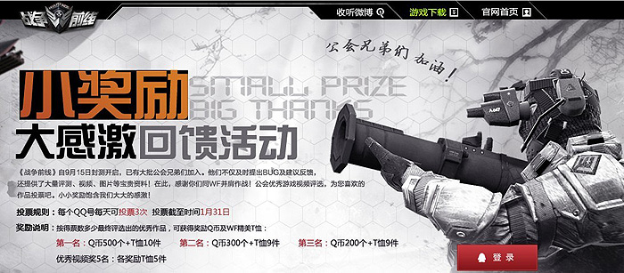 公会上传视频享惊喜回馈 即日起至2012年1月31日,凡于“小感激大感激回馈活动”中上传游戏视频的公会玩家,均有机会赢取Q币、周边T恤等珍贵好礼。游戏玩家们还可在鉴赏各类精彩视频的同时,为自己喜欢的视频投出珍贵的一票,评选出最优秀的作品以供更多玩家赏析。