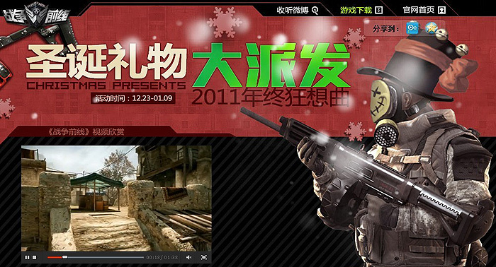 腾讯游戏旗下全新FPS网游《战争前线》(英文名:Warface)圣诞主题月全新版本已于22日正式登场,玩家们即刻登录游戏便可参与到官方精心筹备的四重精彩活动之中,与众多FPS精英玩家共享年终狂欢!年终狂欢曲:http://wf.qq.com/act/a20111219decemb