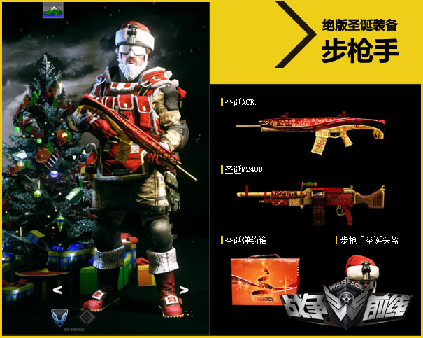 腾讯游戏旗下军事射击类网游《战争前线》(英文名:Warface)于圣诞节到来前夕推出了全新节日版本,并带来了包括新增地图、新型武器、圣诞节主题装备在内的诸多新鲜玩点。圣诞节版本专题页面:http://wf.qq.com/act/a20111218ce/index.htmPVP模式